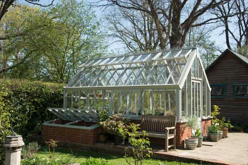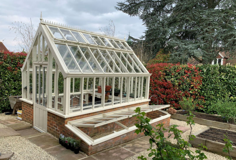 Slender 2.6 m x 4.9 m very high quality greenhouse with plentiful ventilation and classic Victorian aluminium glazing—excellent for dedicated