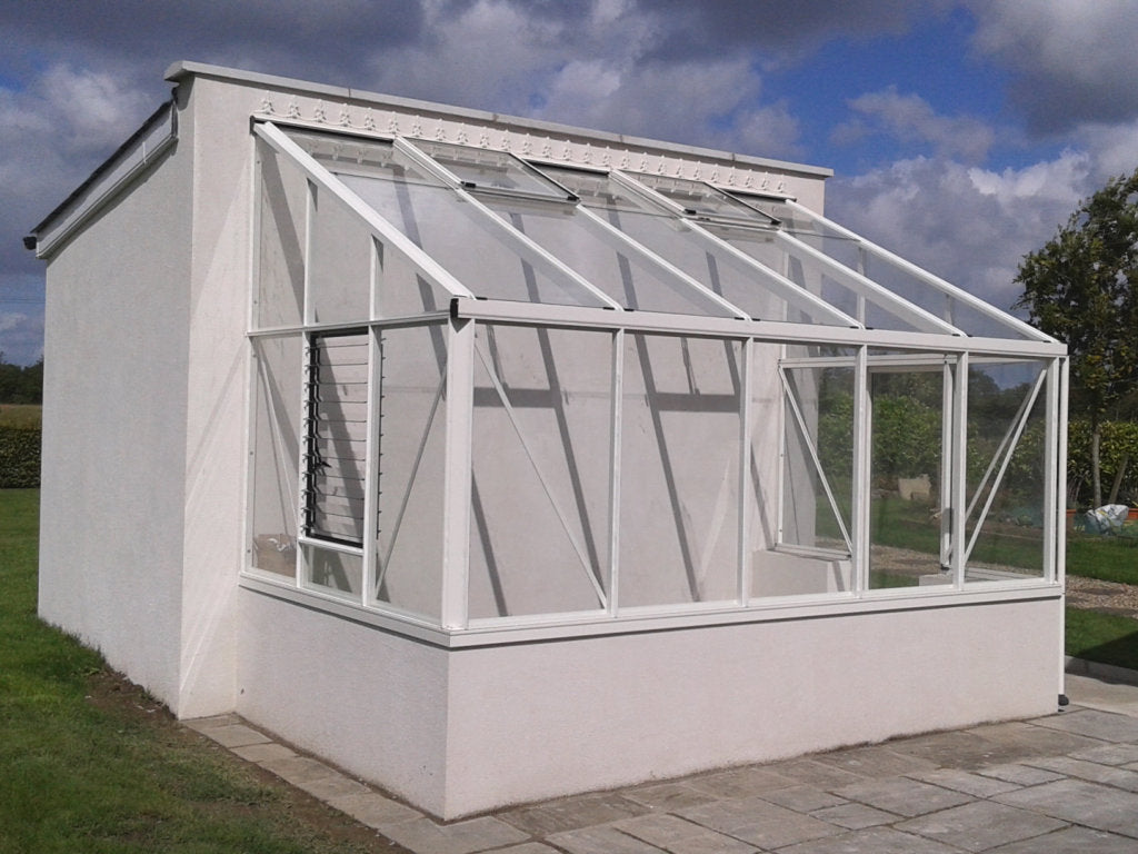 These models are ‘glass to ground’ Arcadia Lean-to Greenhouses in a very durable and attractive powder coated (coloured) finish. Green, White or Black are the standard colours but other colours are available on request.