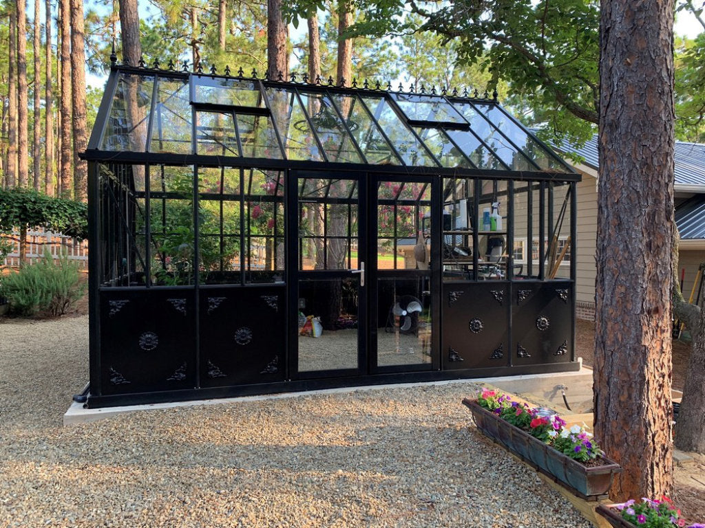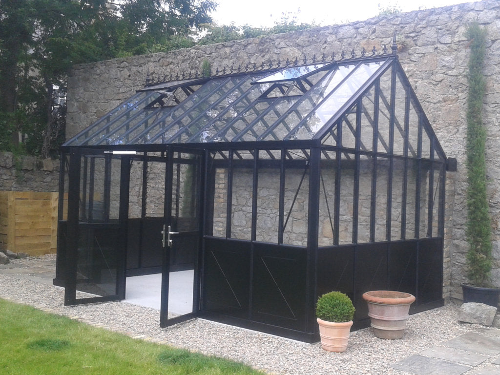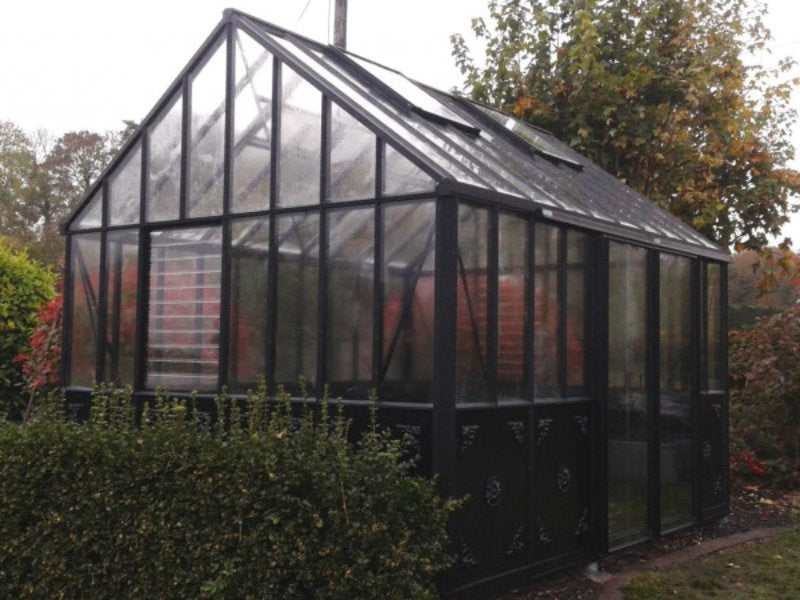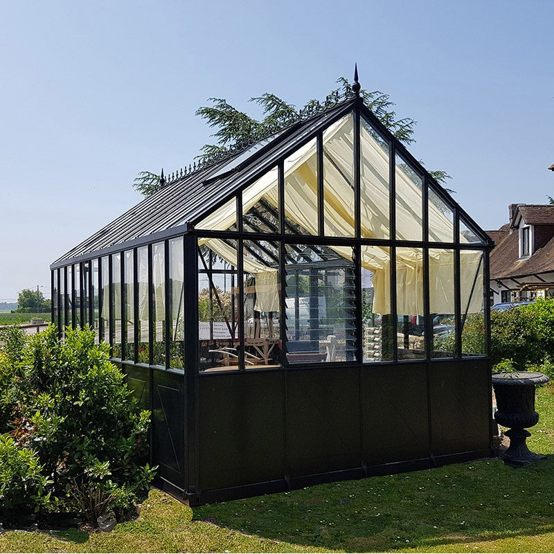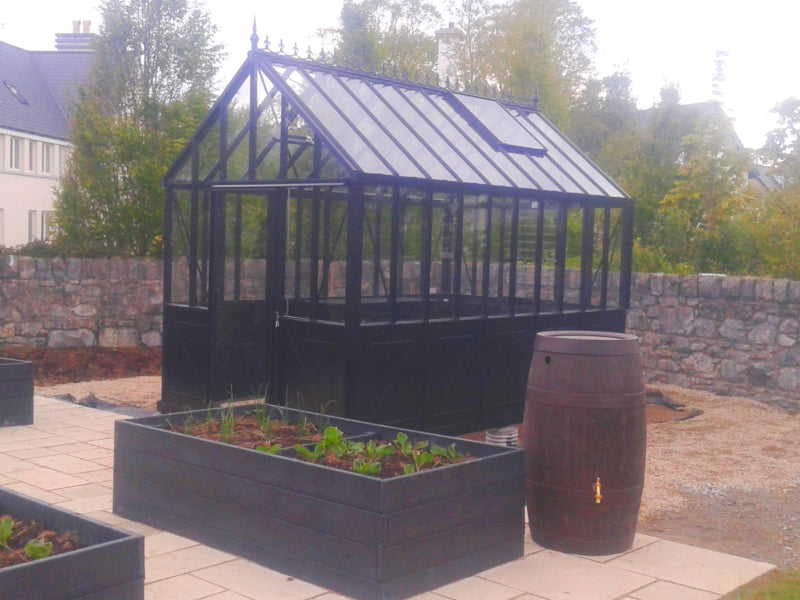 The Eos 200 is characterised by its traditional looking steep roof angle (38°) and spacious 2m high sides. The aluminium panels around the bottom of the walls which are available in a number of designs give a very attractive look to this Greenhouse. This model is often used as a Garden Room for rest and recreation – for example as an artists studio. The aluminium panels reduce light to the floor area so unless growing shade loving plants some of our aluminium benching and shelving will be the solution to offer the plants up to get more light when using it as a Greenhouse.