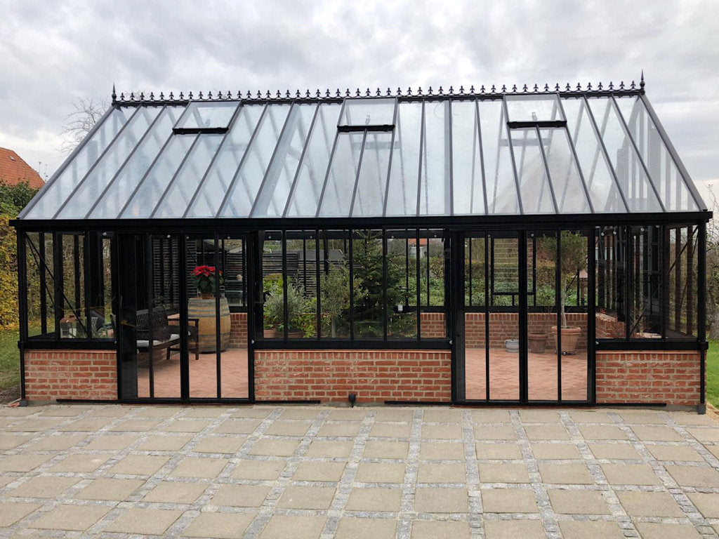 The Gigant is a fantastic super strong Glasshouse with large stanchions (portal frames) supporting the structure. This is a custom model with a wide range of options to choose from including up to 90cm extra height, a Dwarf Wall version, an aluminium panelled version as well as aesthetic details like the colour of the frame, the width of panes of glass etc.