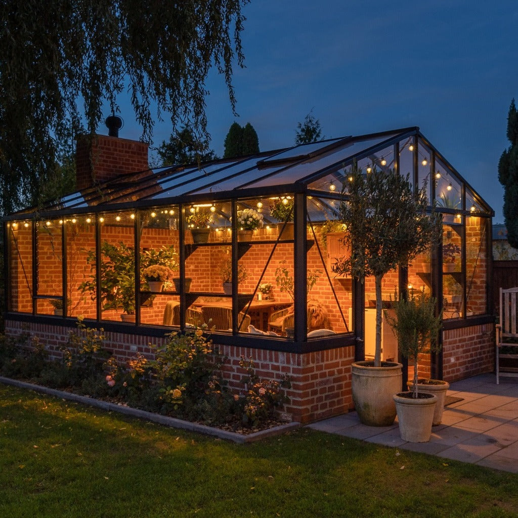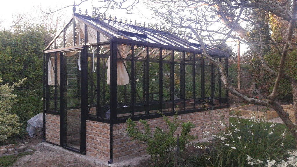Helios 200 ‘Dwarf Wall’ Greenhouses are made with strong ‘box section’ Janssen aluminium profiles which are polyester powder coated in a choice of a lovely dark green colour (RAL6009), an elegant black (RAL9005), or a stunning white (RAL9010). They can be powder coated in other RAL colours for an extra cost.